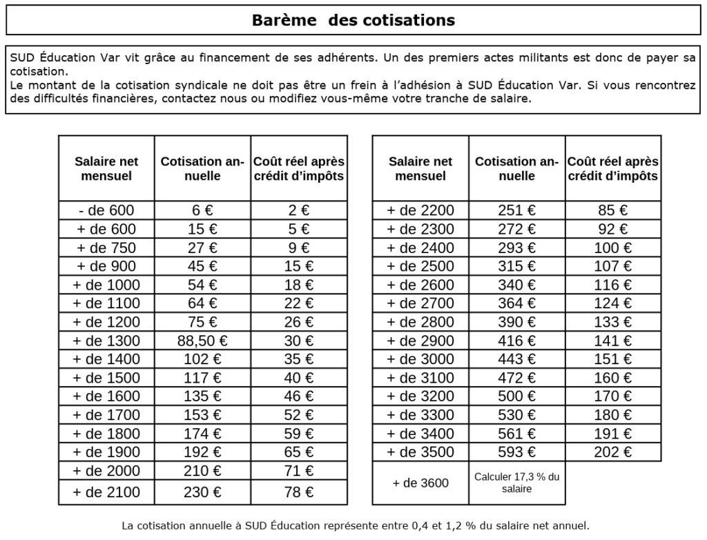 L’adhésion per­met aussi de contri­buer au fonc­tion­ne­ment de SUD édu­ca­tion Var, de la fédé­ra­tion des syn­di­cats SUD édu­ca­tion et de l’Union syn­di­cale Solidaires (locaux, outils de com­mu­ni­ca­tion, repro­gra­phie, documentation…).
