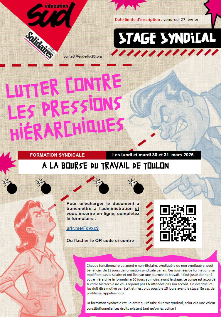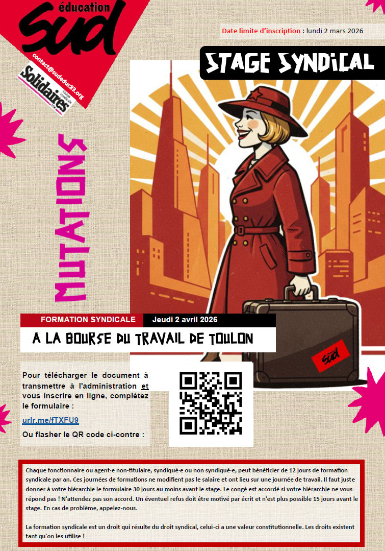 Chaque fonctionnaire ou agent·e non-titulaire, syndiqué·e ou non syndiqué·e, peut bénéficier de 12 jours de formation syndicale par an. Ces journées de formations ne modifient pas le salaire et ont lieu sur une journée de travail. Il faut juste donner à votre hiérarchie le formulaire 30 jours au moins avant le stage. Le congé est accordé si votre hiérarchie ne vous répond pas ! N'attendez pas son accord. Un éventuel refus doit être motivé par écrit et n'est plus possible 15 jours avant le stage. En cas de problème, appelez-nous.
