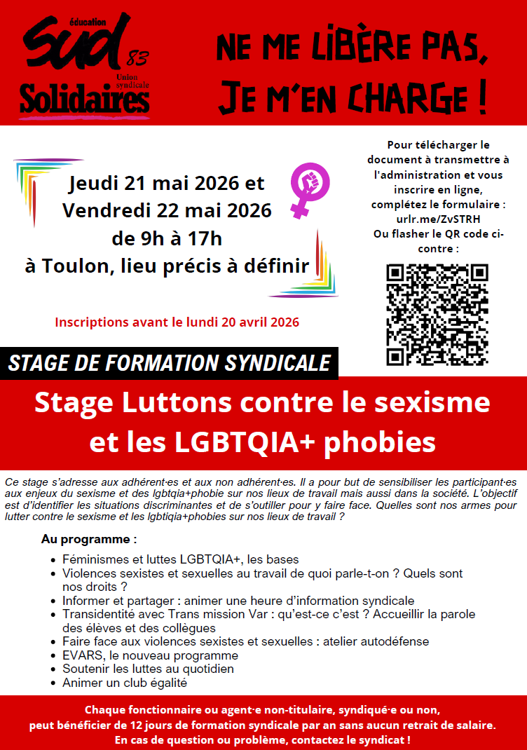 Jeudi 21 et vendredi 22 mai 2026 : Stage Luttons contre le sexiste et les lgbtqia+phobies