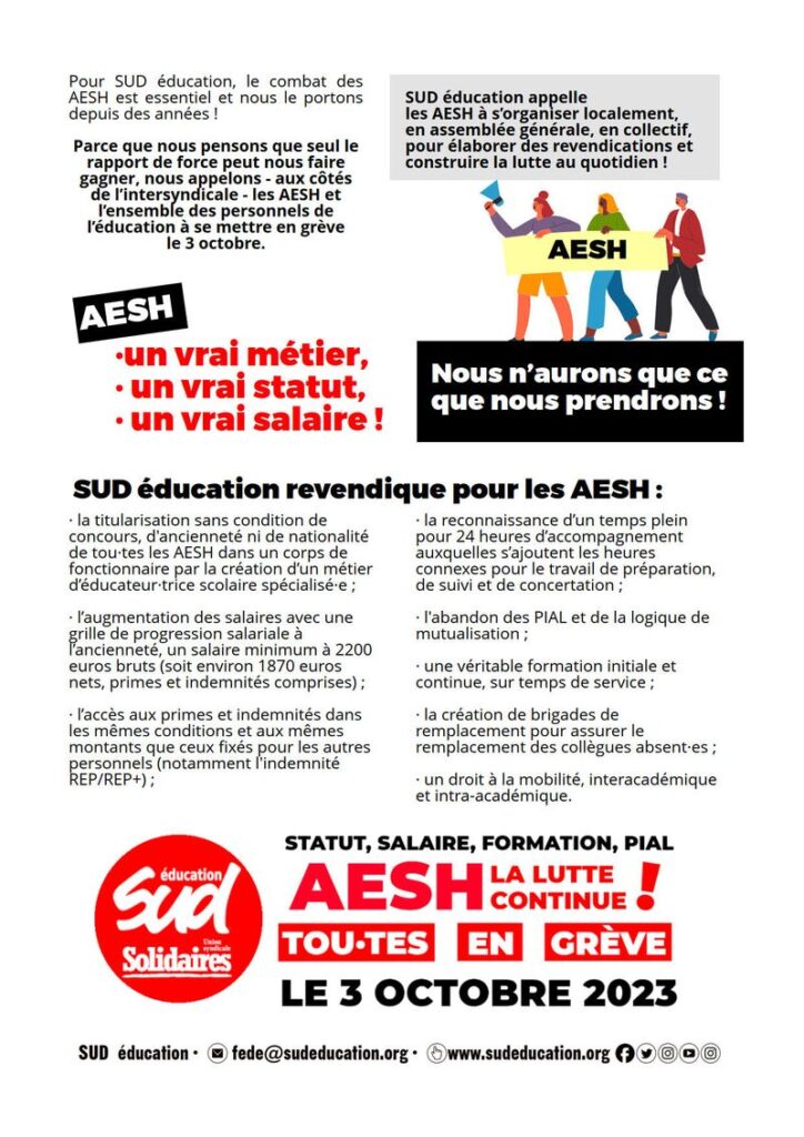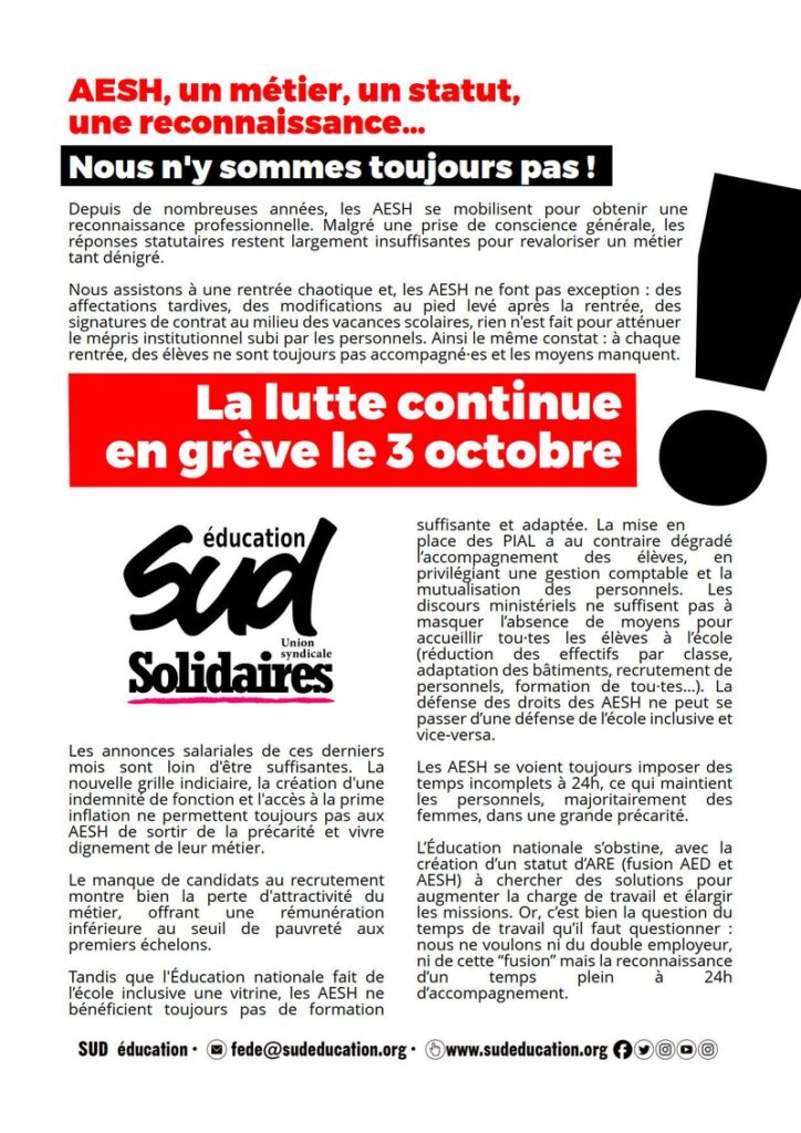 Pour SUD éducation, le combat des AESH est essentiel et nous le portons depuis des années ! Parce que nous pensons que seul le rapport de force peut nous faire gagner, nous appelons -aux côtés de l’intersyndicale- les AESH et l’ensemble des personnels de l’éducation à se mettre en grève le 3 octobre.