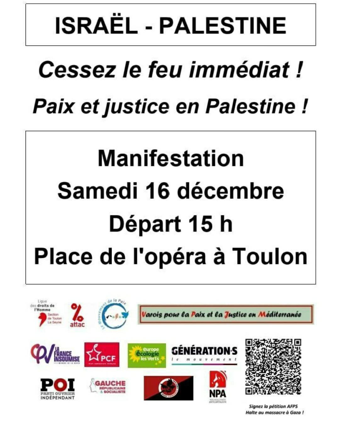 samedi 16 décembre Manifestation pour un cessez-le-feu, pour la paix et la justice en Israël-Palestine, 15h, Place de l’opéra, TOULON
