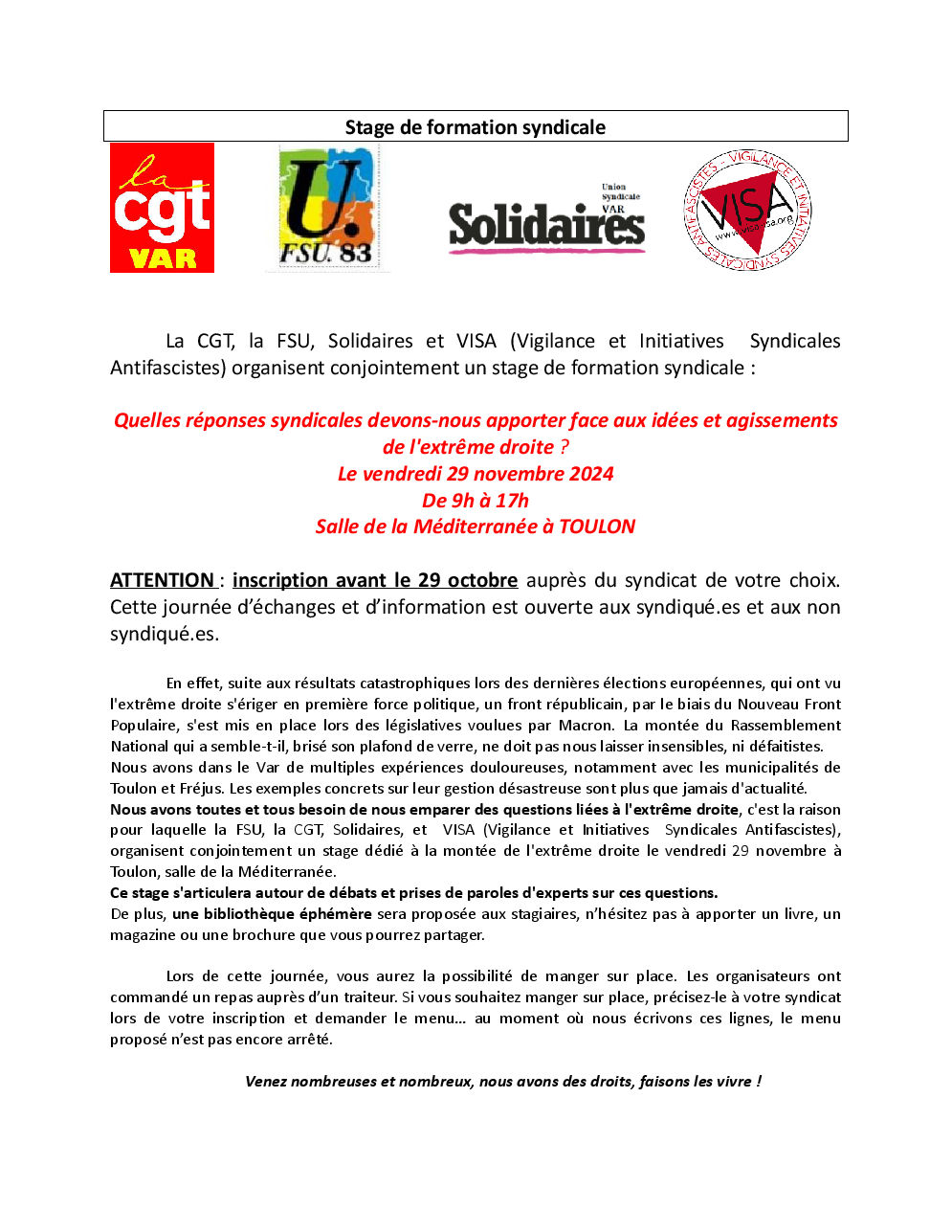 Nous avons toutes et tous besoin de nous emparer des questions liées à l'extrême droite, c'est la raison pour laquelle la FSU, la CGT, Solidaires, et VISA (Vigilance et Initiatives Syndicales Antifascistes), organisent conjointement un stage dédié à la montée de l'extrême droite le vendredi 29 novembre à Toulon, salle de la Méditerranée.